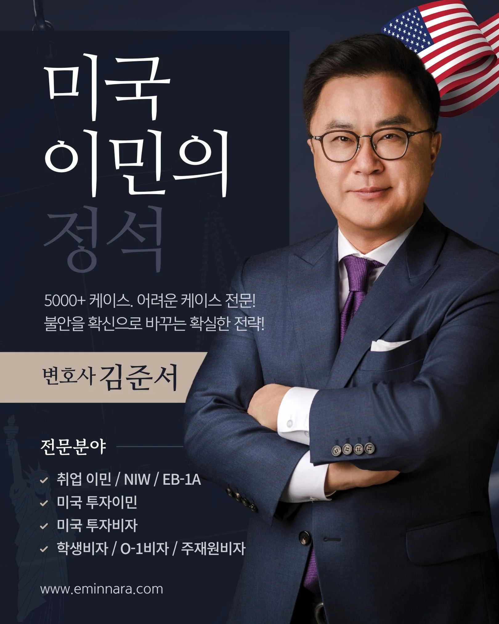 저는 지난 수년간, 미국 전역 50개 주는 물론 세계 각국의 고객들에게 5,000여건이 넘는 이민관련 케이스를 처리하며 미국의 이민법을 자문 변호하고, 어렵게만 느껴지는 이민의 길에 든든한 다리 역할을 하며, 미국 내 한인들이 이민자로서의 합법적인 권리를 가질 수 있도록 힘이 되고자 노력해왔습니다.