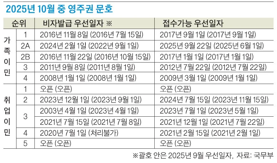 15일 국무부의 ‘2025년 10월 영주권 문호’에 따르면, 영주권자의 배우자와 미성년 자녀 등 직계가족이 대상인 2A순위의 영주권 비자발급 우선일자는 2022년 9월 1일에서 2024년 2월 1일로 1년 5개월 앞당겨졌다.