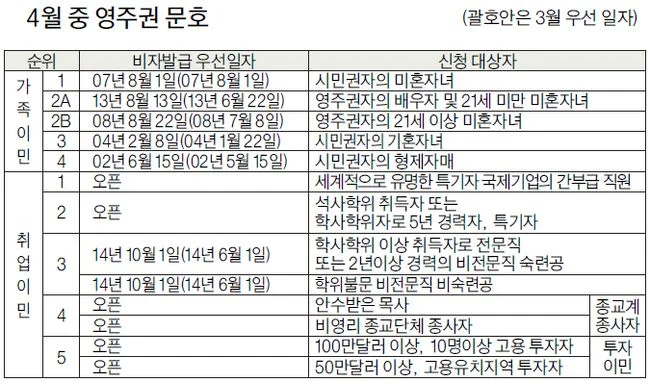 11일 국무부가 발표한 4월 중 영주권 문호에서 취업 3순위 우선일자는 2014년 10월 1일을 기록했다. 지난 달보다 4개월 빨라졌다.